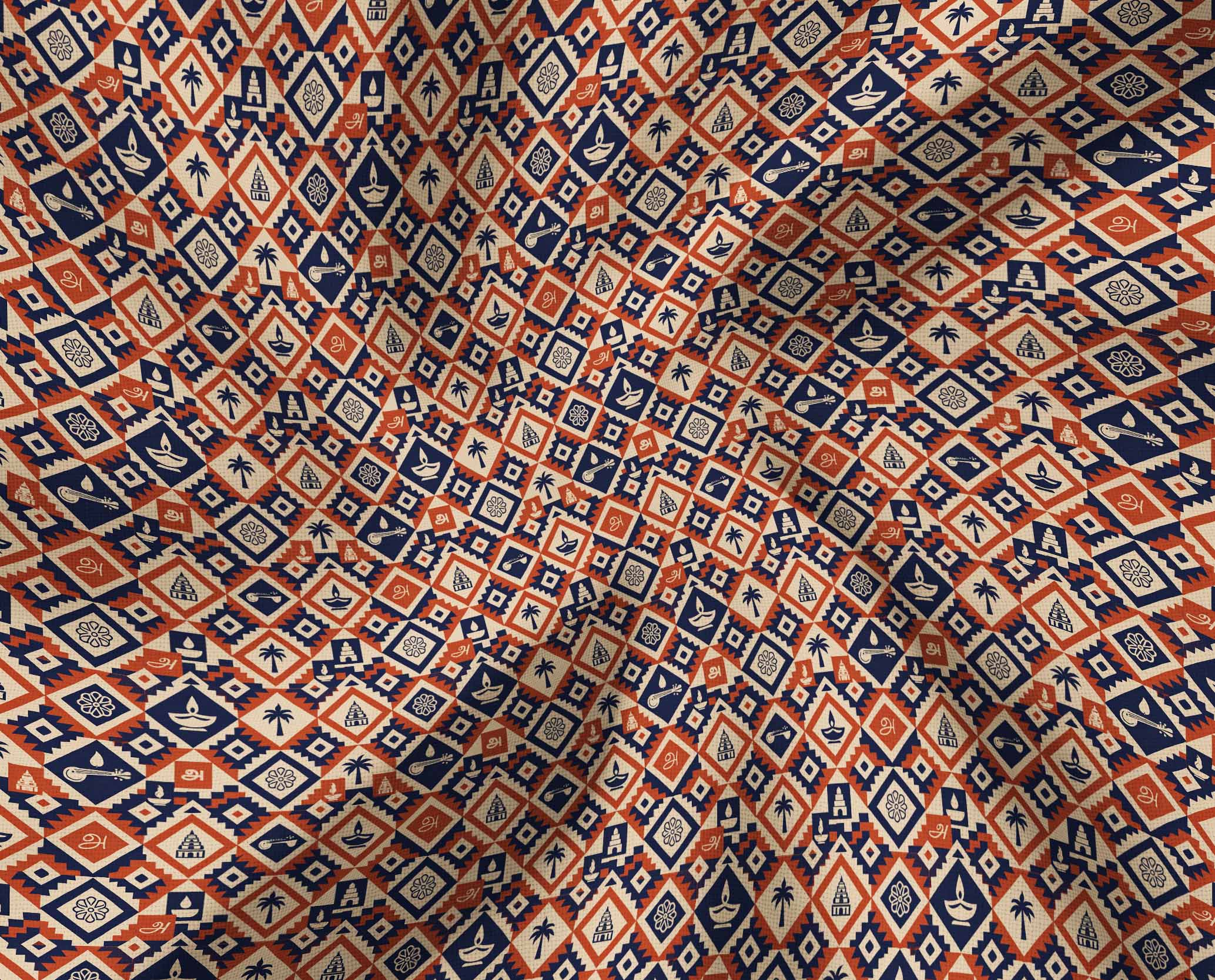 The design is deeply rooted in modern tribal inspiration, brought to life through a seamless geometric pattern. The layout features repeating diamonds, zigzags, and bold flat shapes arranged in a structured grid, creating a visually striking rhythm across the fabric. What makes this dress truly special is the thoughtful inclusion of minimalist Tamil cultural icons within selected blocks. Subtle yet powerful elements such as a simplified temple gopuram silhouette, kolam motif, veena outline, the Tamil letter “அ”, traditional oil lamp (vilakku), and palm tree icon are intricately woven into the pattern. These details add a layer of storytelling, connecting tradition with modern design in a way that feels both artistic and wearable.