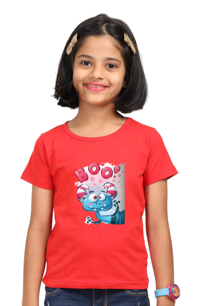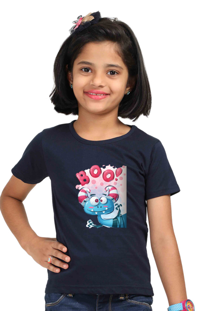Our classic girls’ crew neck graphic tees is designed for everyday wear with a charming cartoon animal graphic sporting big, round eyes and the catchy “Boo!” print. Crafted from 100% premium cotton, it offers unparalleled softness that’s perfect for all-day comfort. This super combed, pre-shrunk tee ensures a lasting fit, while the bio-washed finish gives it a smooth, gentle feel against the skin.