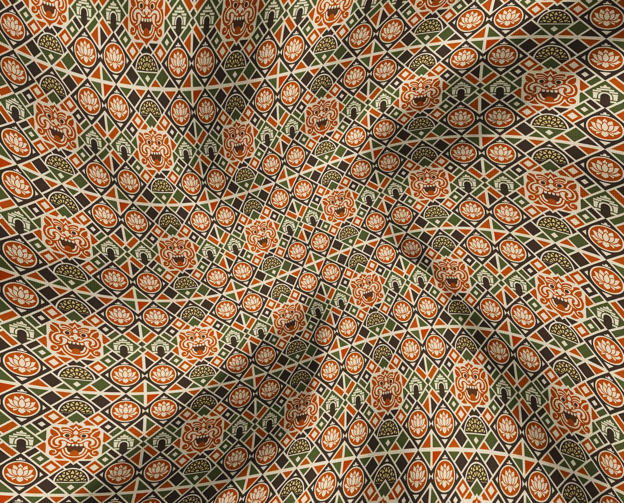 The design showcases a carefully crafted repeated line-art pattern in a rich brown tone, translating traditional sculptural elements into wearable art. You’ll notice subtle yet striking motifs like lotus medallions, temple arch shapes, yali face outlines, and mandala fragments — each element simplified into clean geometric blocks for a refined, minimal aesthetic. The result is a sophisticated pattern that feels both rooted and refreshingly modern, making it ideal for today’s versatile lifestyle.