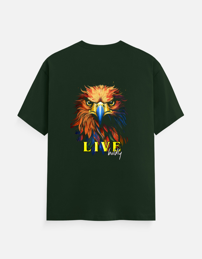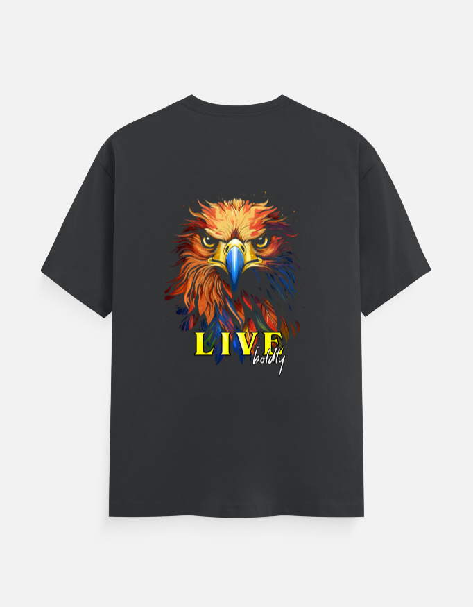 - Graphic: A lifelike eagle in a direct, forward-facing stance, accented by the phrase “Live Boldly.”