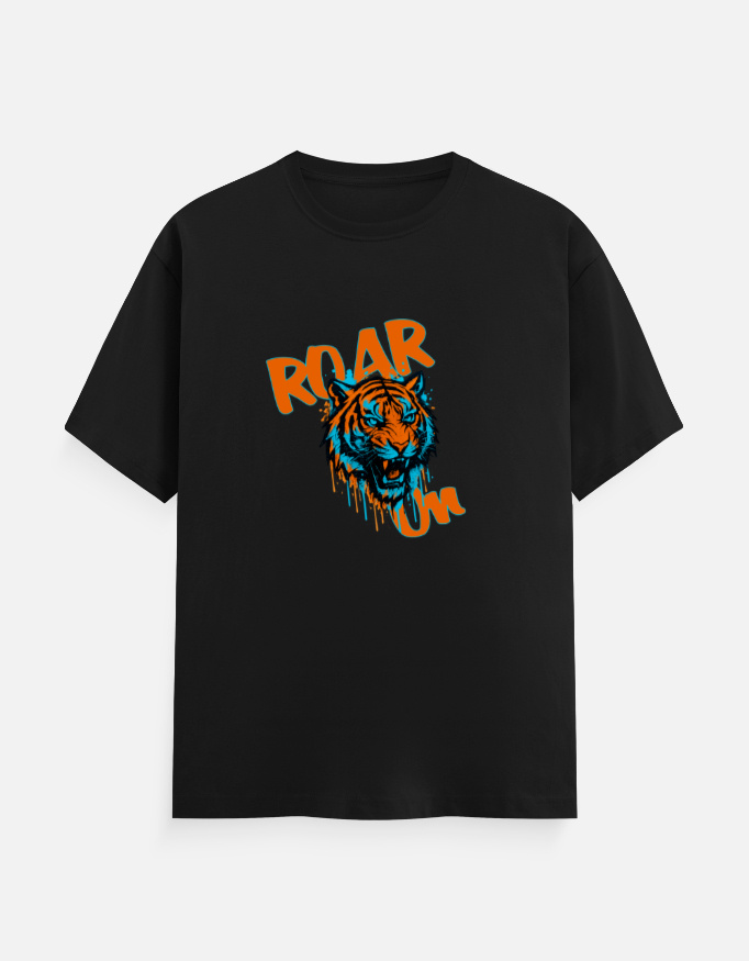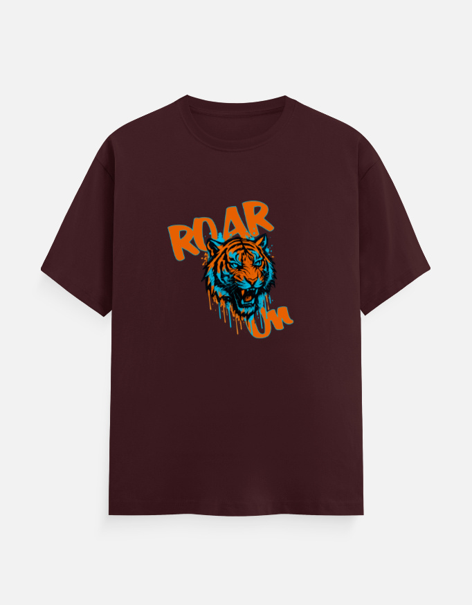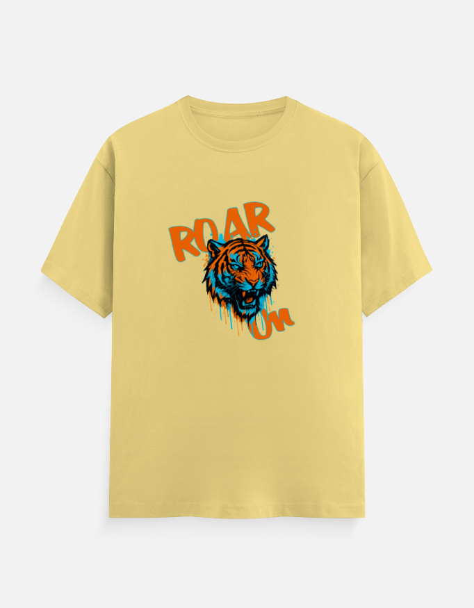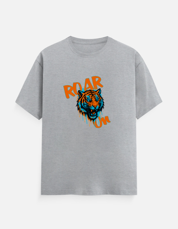- Paint-drifted cartoonist fierce lion graphic with bold “Roar On” text