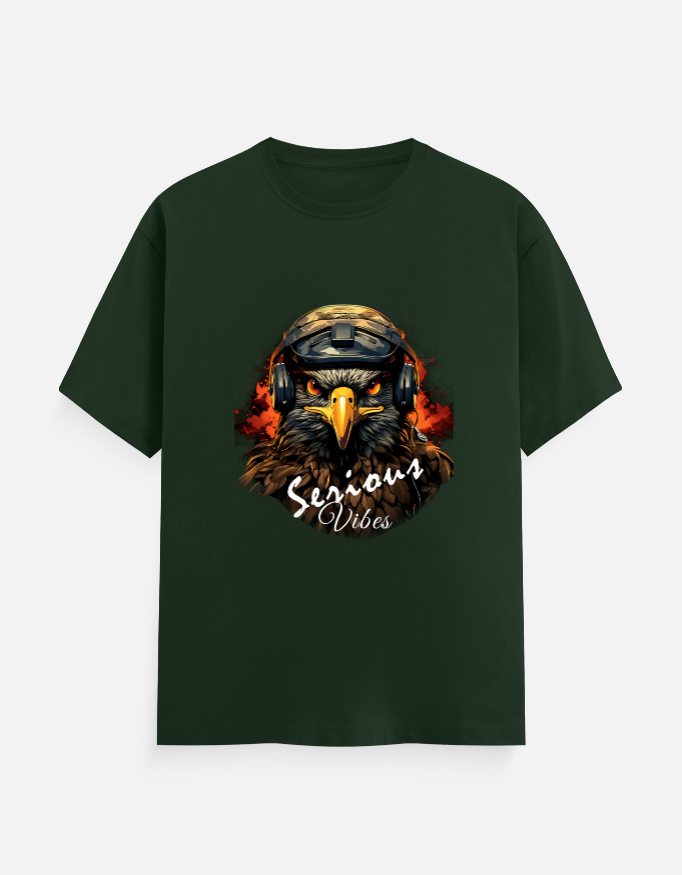 - Graphic: A lifelike eagle wearing a headset, paired with the bold phrase “Serious Vibes.”
