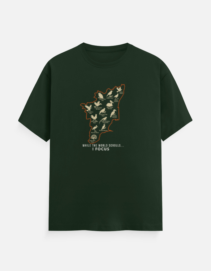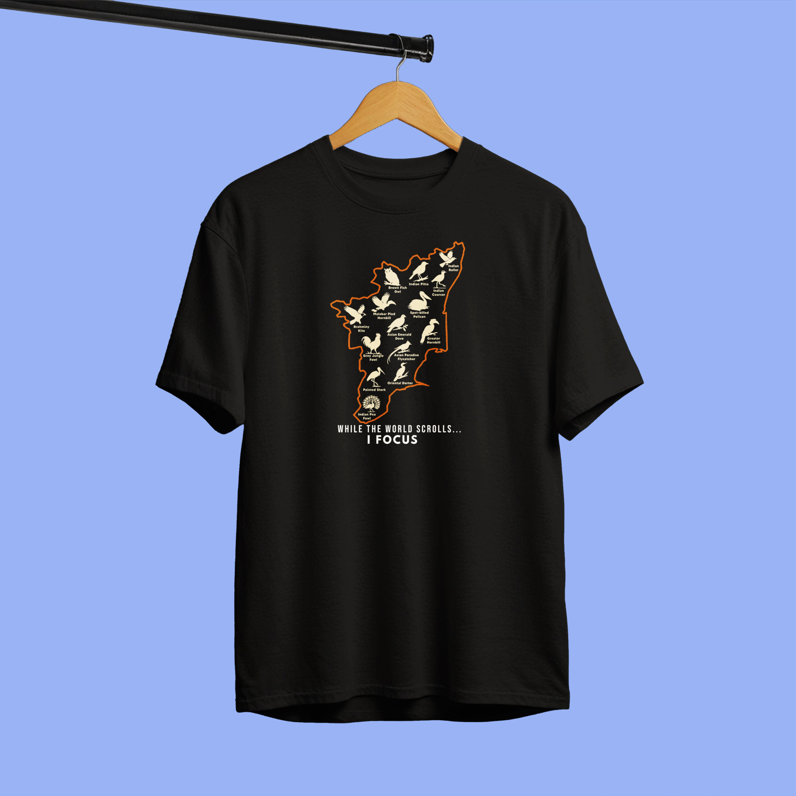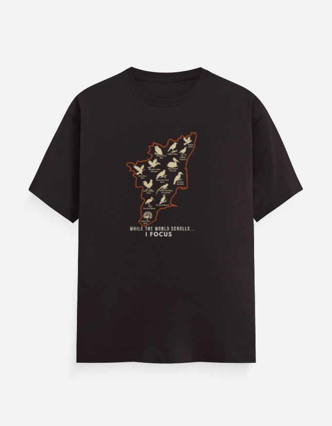 In a world that never stops scrolling, choosing to focus is powerful. The Minimal Birding and Nature Lover Tees for Men by Sudhiya is more than just a T-shirt — it is a statement of identity. Featuring the elegant outline of Tamil Nadu filled with silhouettes of the state’s most iconic birds and their names, this design quietly speaks to those who observe, appreciate, and connect deeply with nature. The thoughtful wording below the map — “While the World Scrolls…” and boldly beneath it, “I FOCUS” — captures the spirit of birders, explorers, and mindful souls.
