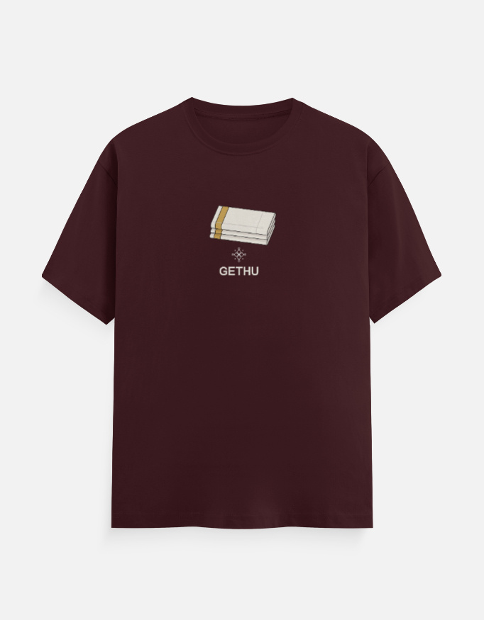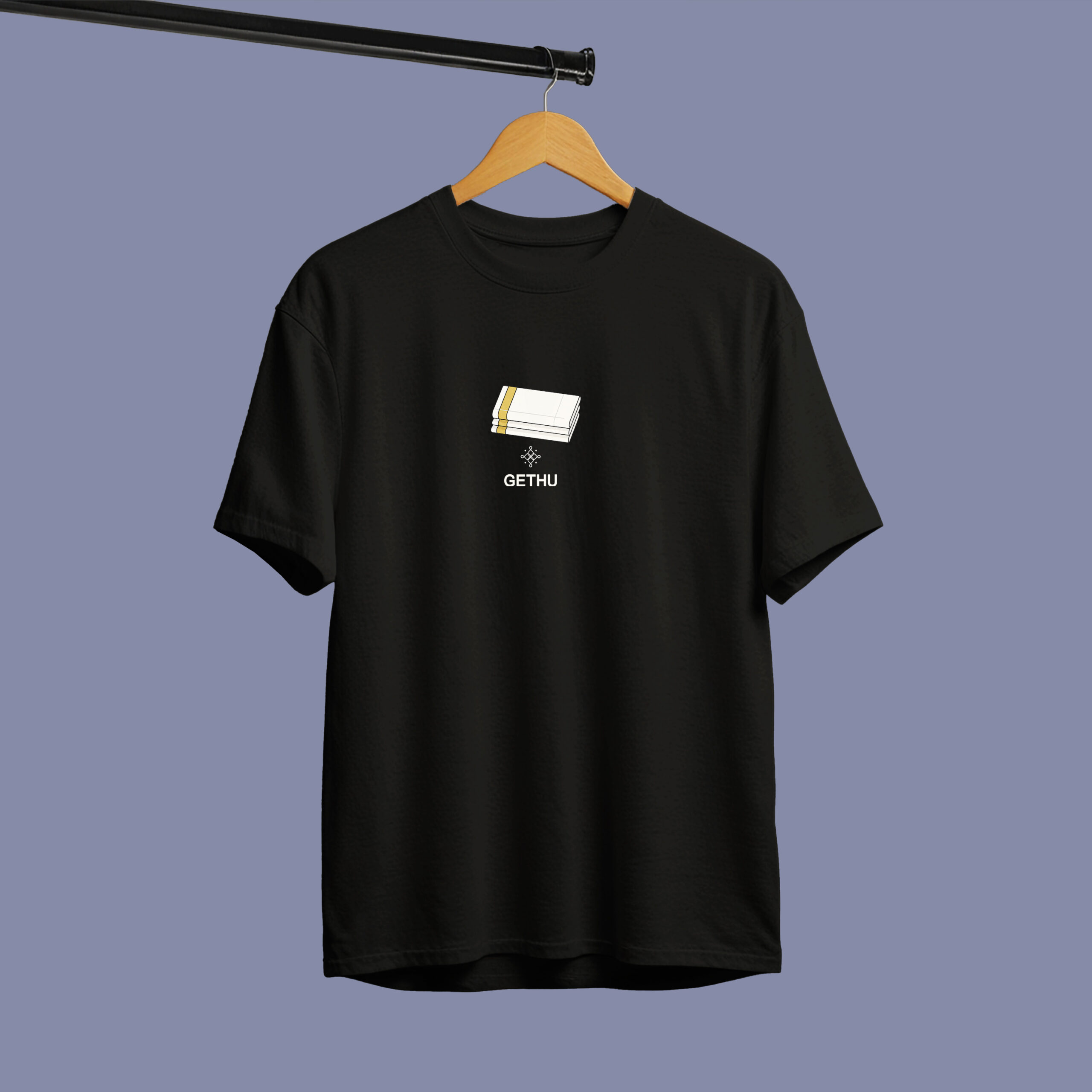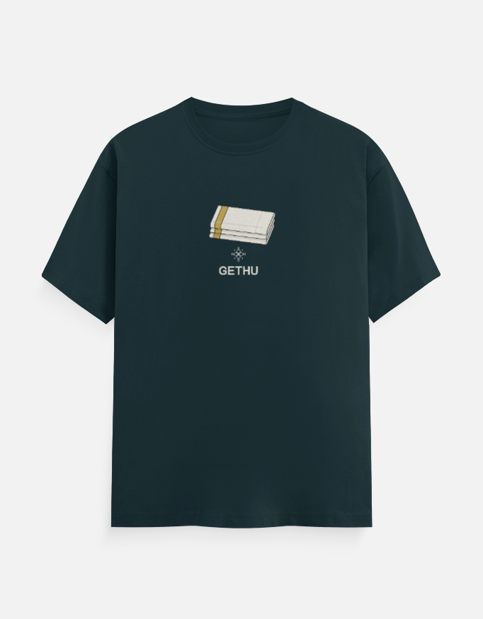 This tee features a Minimal DTG Print, known for its excellent color sharpness and smooth finish. The design sits naturally on the fabric, maintaining a premium look without the heavy patch-like feel seen in other printing methods. The crisp depiction of the vaesti fold and the “GETHU” text gives the tee its confident yet clean identity.