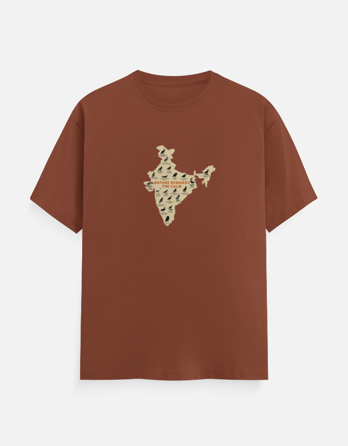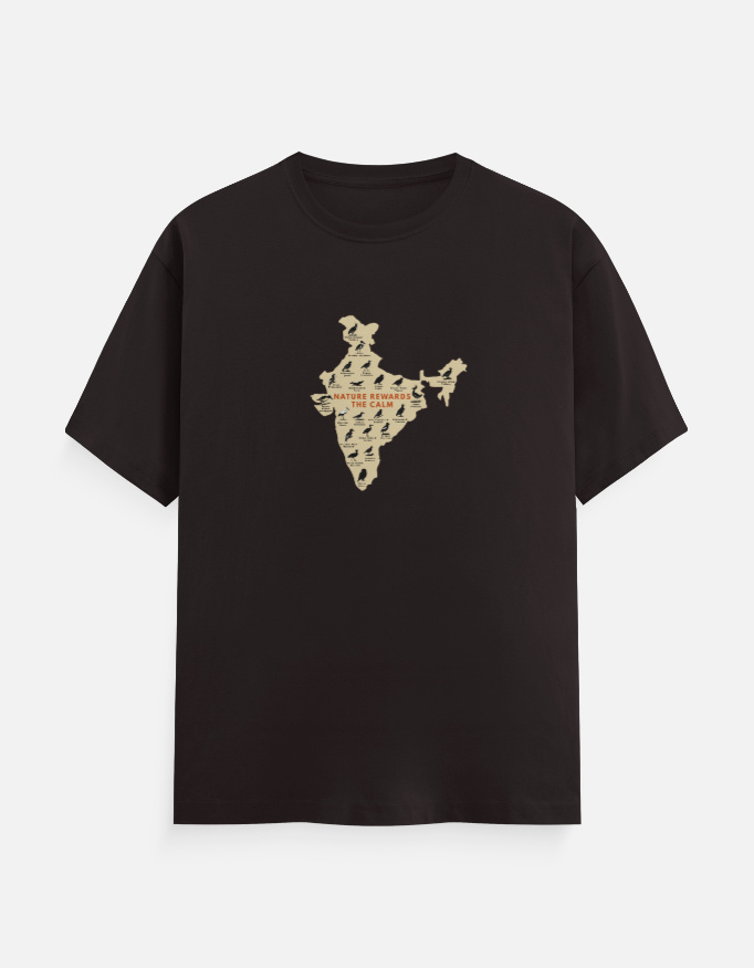 The India map silhouette in subtle light coffee brown adds warmth and depth to the design. Inside the map are carefully placed silhouettes of rare and endangered birds, each named to honor their existence and importance. The minimal DTG print ensures clean detailing while maintaining a smooth and breathable fabric feel.