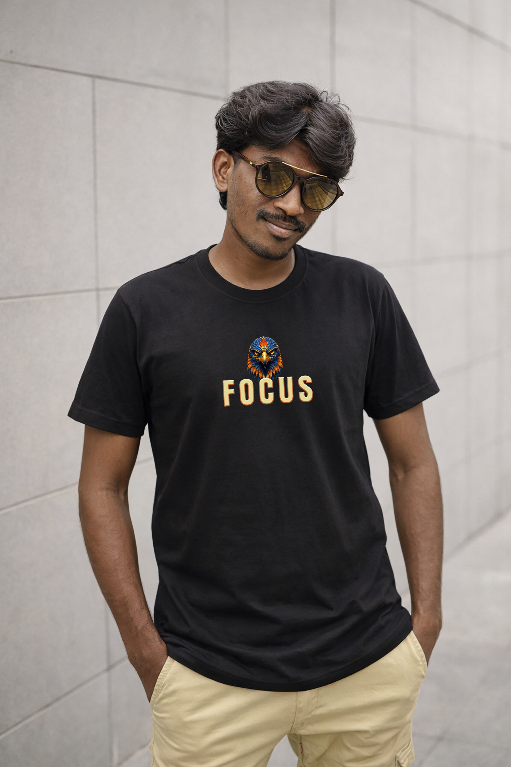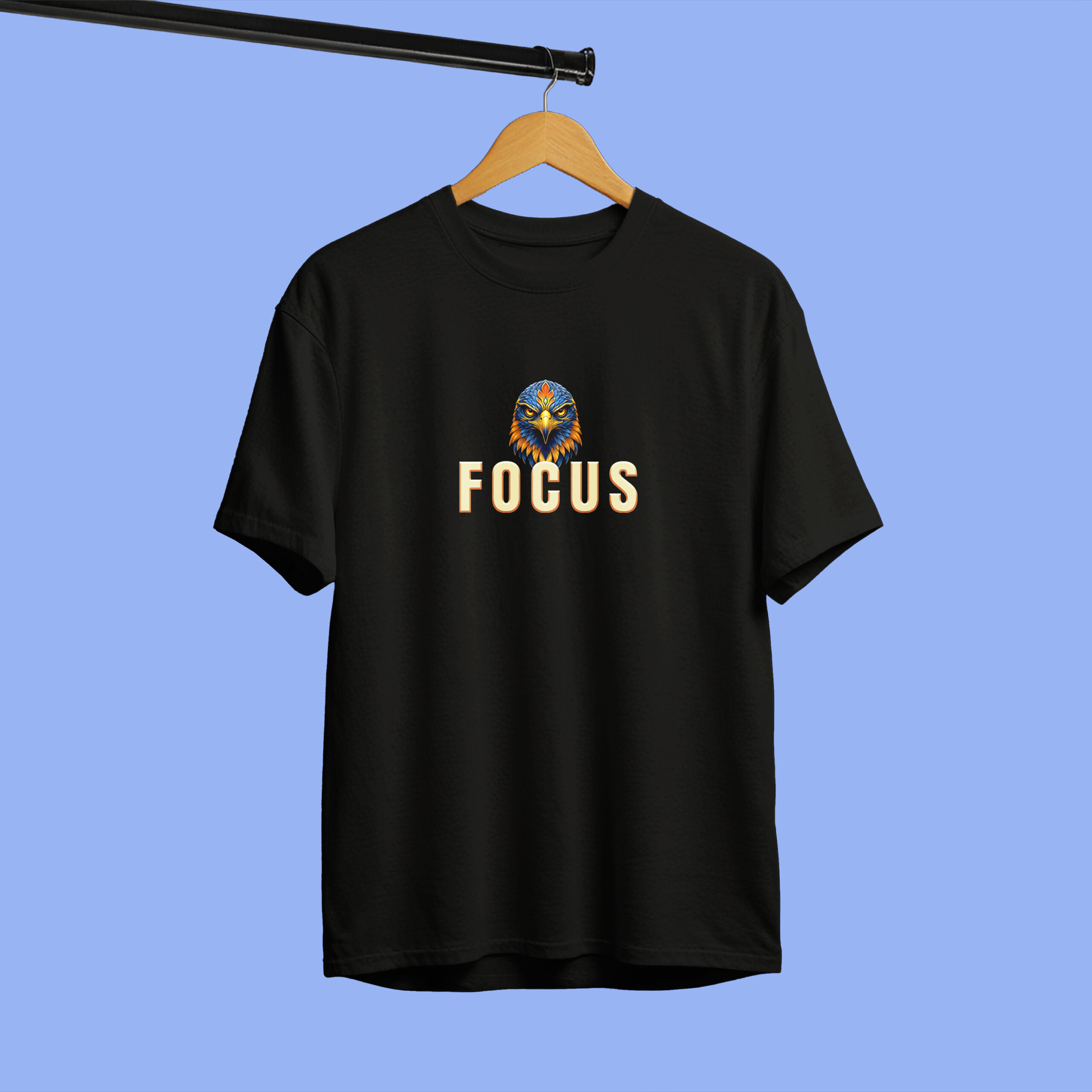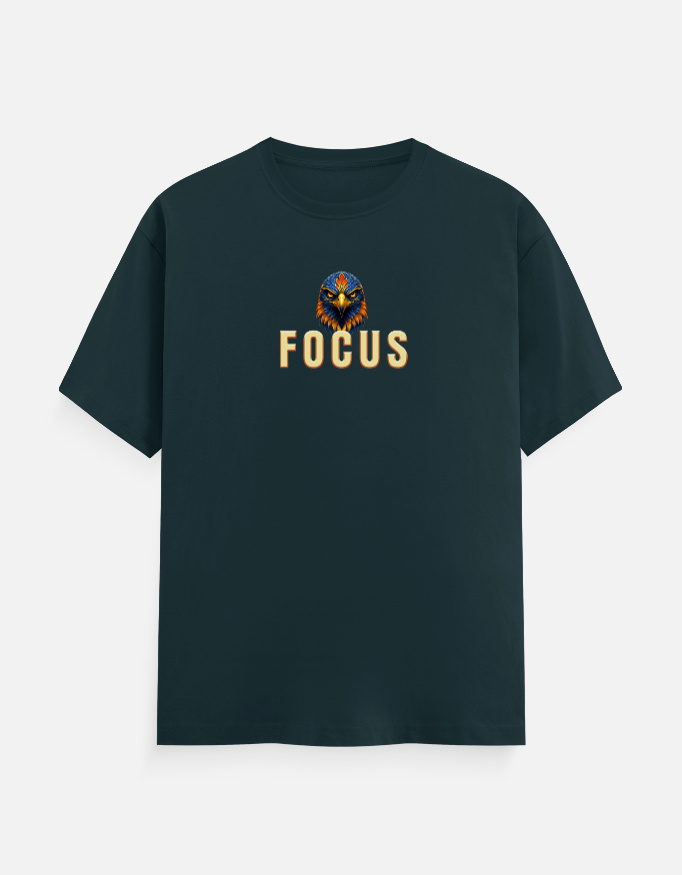 The design is printed using a minimal DTF (Direct-to-Film) print technique, which ensures crisp detailing and long-lasting quality without adding unnecessary weight to the fabric. Unlike bulky prints, this minimal graphic maintains the softness of the t-shirt, making it feel natural and easy to wear. The kite head illustration is clean and sharp, complementing the bold “FOCUS” typography to create a balanced, modern look.