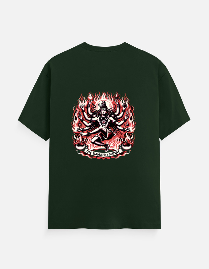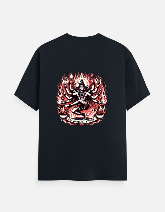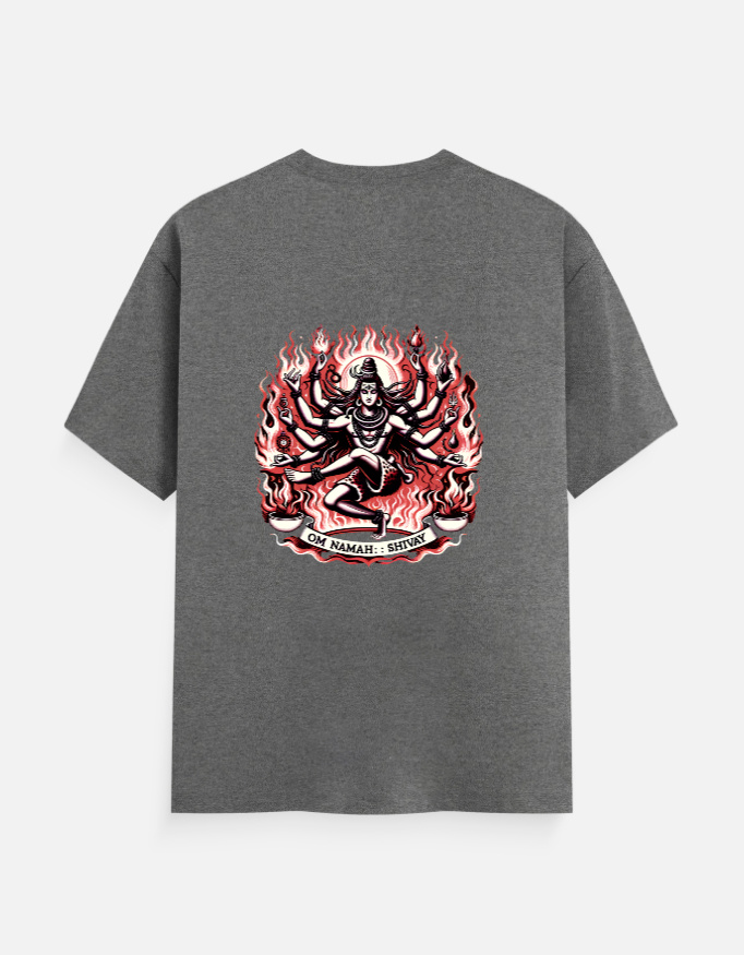 The back features a stunning, detailed image of Lord Shiva in his cosmic dance pose, symbolizing creation, preservation, and destruction—core themes of Hindu spirituality. Crafted from **100% cotton**, this **super combed, pre-shrunk T-shirt** ensures long-lasting comfort and a perfect fit. The **Lycra Ribbed neck** and **bio-washed** finish provide a premium feel, while the **regular fit** makes it suitable for everyday wear.