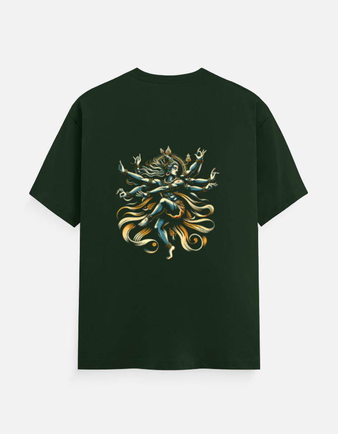 The back features a stunning, detailed image of Lord Shiva in his cosmic dance pose, symbolizing creation, preservation, and destruction—core themes of Hindu spirituality. Crafted from **100% cotton**, this **super combed, pre-shrunk T-shirt** ensures long-lasting comfort and a perfect fit. The **Lycra Ribbed neck** and **bio-washed** finish provide a premium feel, while the **regular fit** makes it suitable for everyday wear.