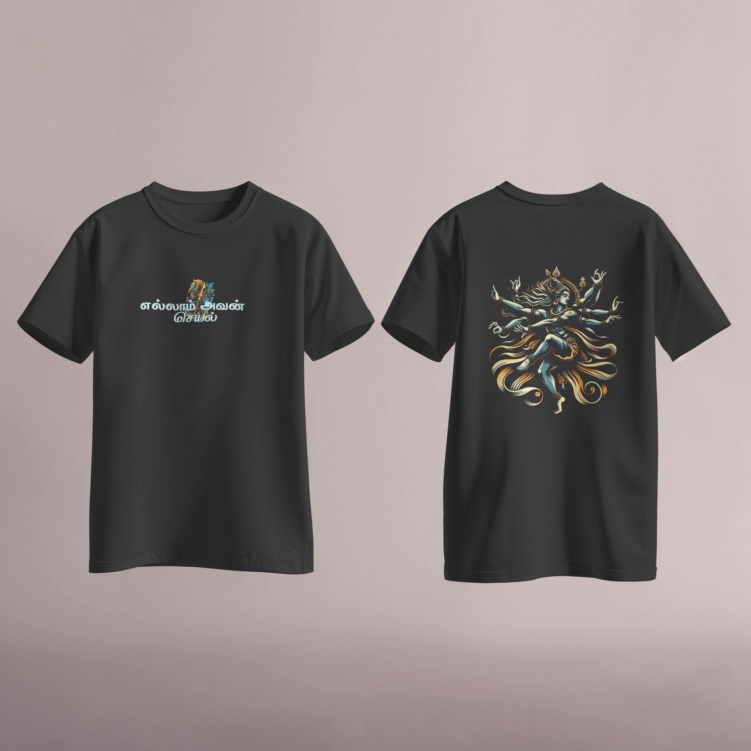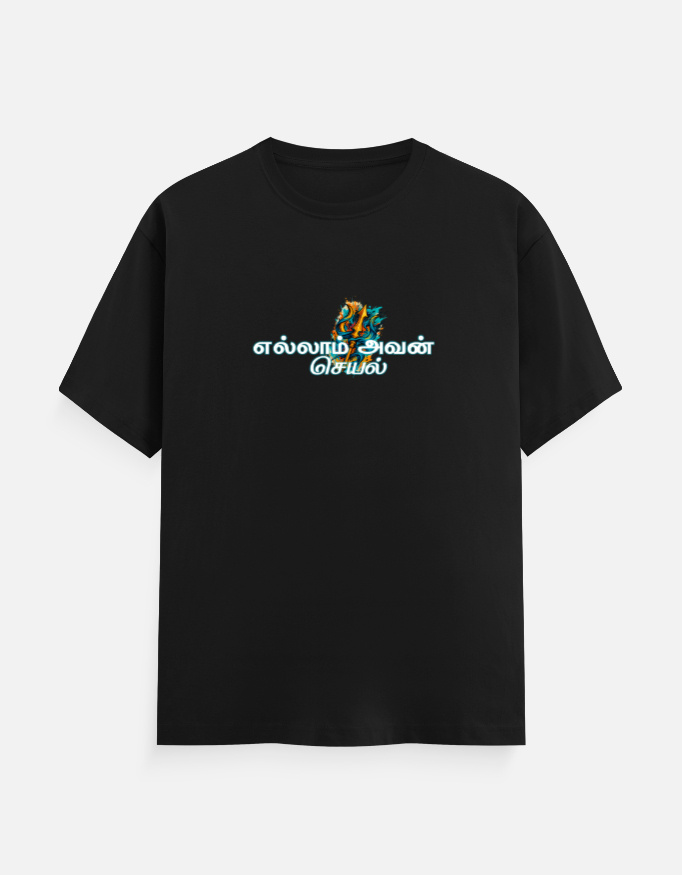 Unleash your spiritual vibe with our **Lord Shiva Dancing Spiritual Tees**, a perfect blend of faith and fashion. This **devotional graphic tee** is designed for those who cherish spirituality and want to express their devotion in style. The front proudly displays the inspiring phrase “எல்லாம் அவன் செயல்” (Everything is His Action), reminding us of the divine presence in all aspects of life.